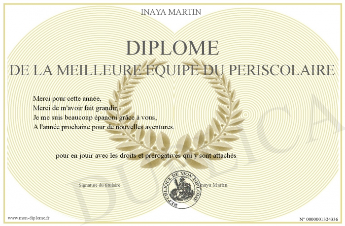 Envoyez par email votre Diplôme de la meilleure équipe du périscolaire personalisé