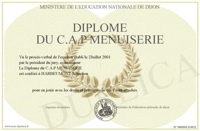 Envoyez par email votre Diplôme du C.A.P MENUISERIE personalisé