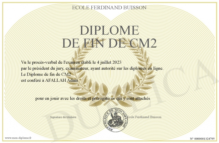 Envoyez par email votre Diplôme de fin de CM2 personalisé