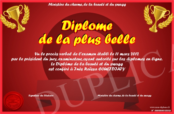 Envoyez par email votre Diplôme de la plus belle personalisé