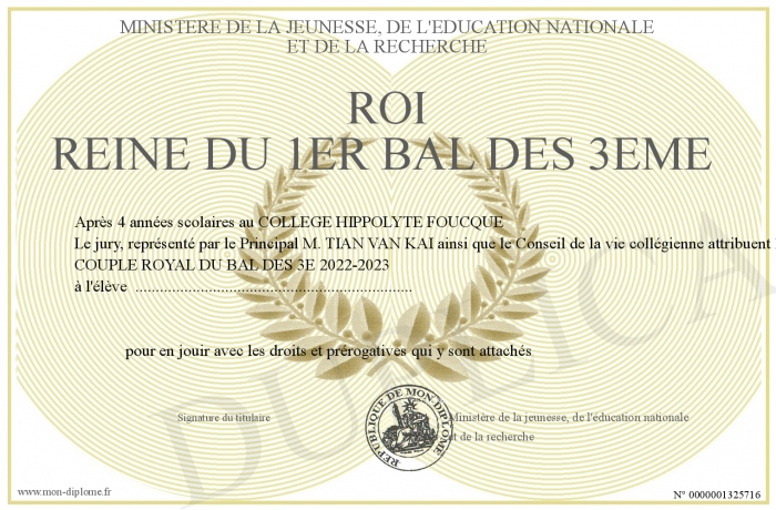 Envoyez par email votre ROI REINE DU 1ER BAL DES 3EME personalisé