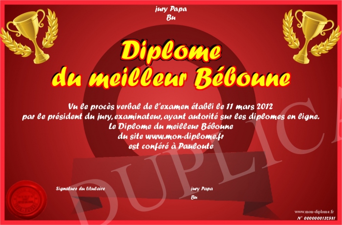Envoyez par email votre Diplôme du meilleur Béboune personalisé