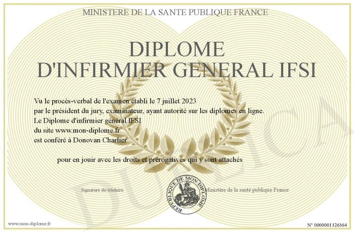 Envoyez par email votre Diplôme d'infirmier général IFSI personalisé
