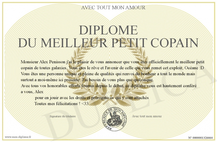 Envoyez par email votre Diplôme du meilleur petit copain personalisé
