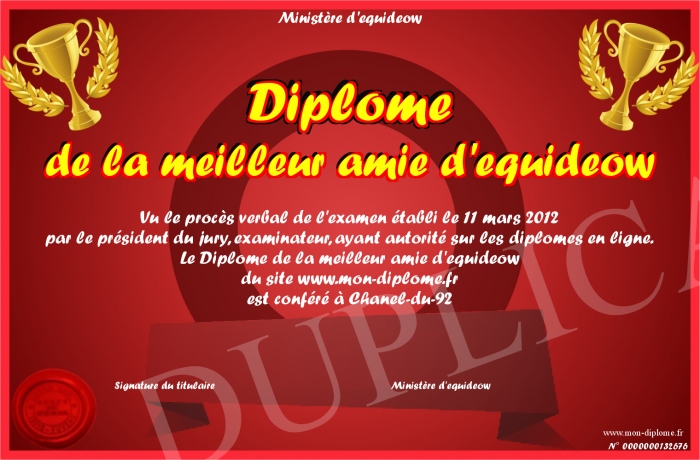 Envoyez par email votre Diplôme de la meilleur amie d'equideow personalisé