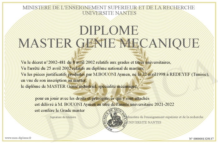 Envoyez par email votre Diplôme Master Génie Mécanique personalisé