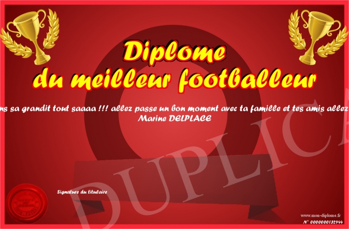 Envoyez par email votre Diplôme du meilleur footballeur personalisé