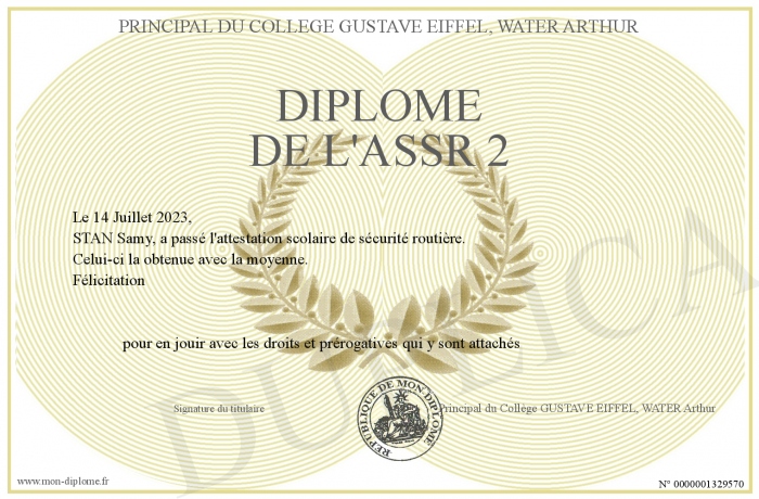 Envoyez par email votre Diplôme de l'ASSR 2 personalisé
