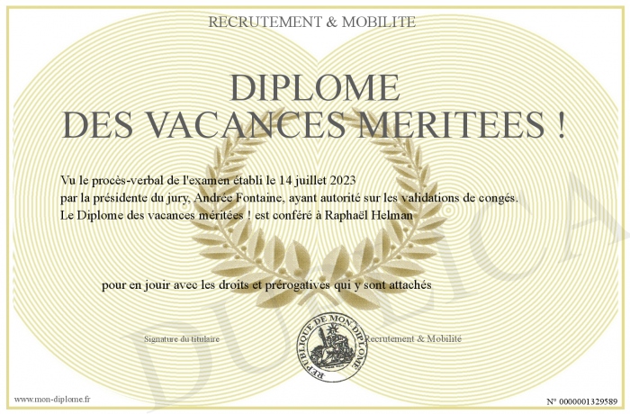 Envoyez par email votre Diplôme des vacances méritées ! personalisé