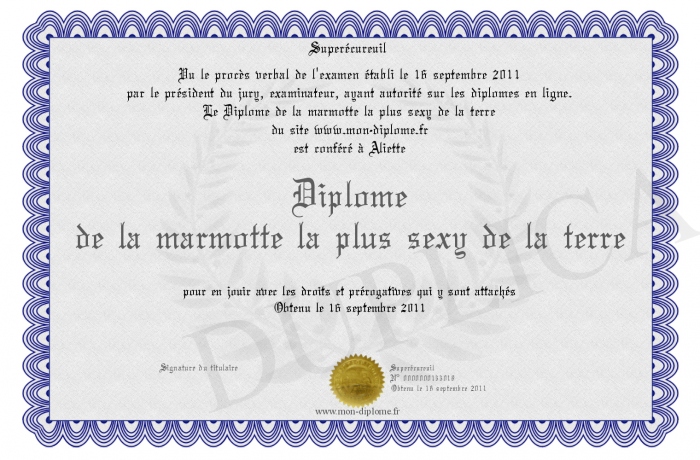 Envoyez par email votre Diplôme de la marmotte la plus sexy de la terre personalisé