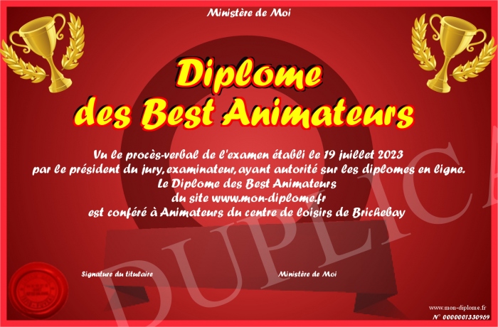 Envoyez par email votre Diplôme des Best Animateurs personalisé
