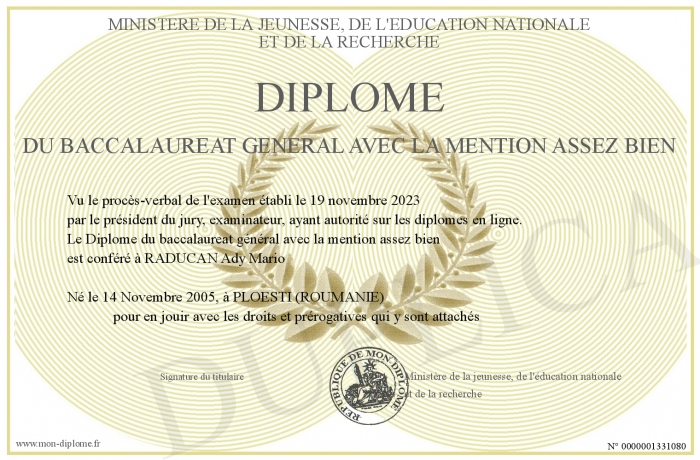 Envoyez par email votre Diplôme du baccalaureat général avec la mention assez bien personalisé