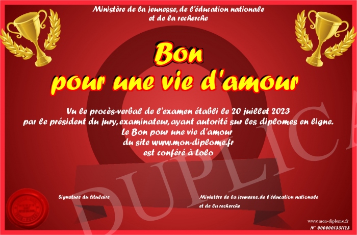 Envoyez par email votre Bon pour une vie d'amour personalisé