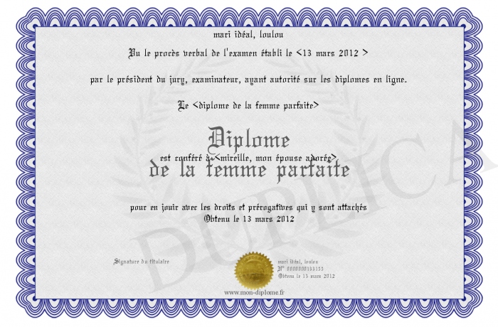 Envoyez par email votre Diplôme de la femme parfaite personalisé