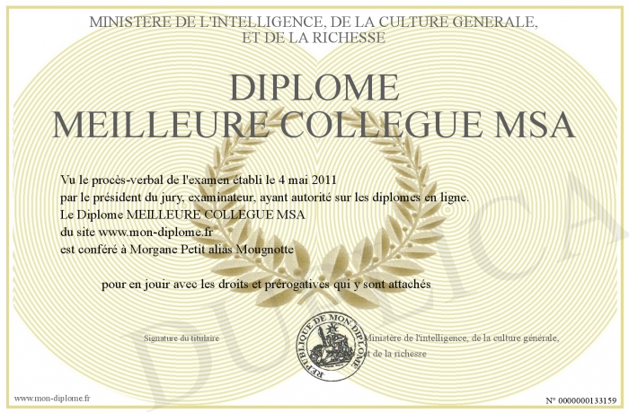 Envoyez par email votre Diplôme MEILLEURE COLLEGUE MSA personalisé