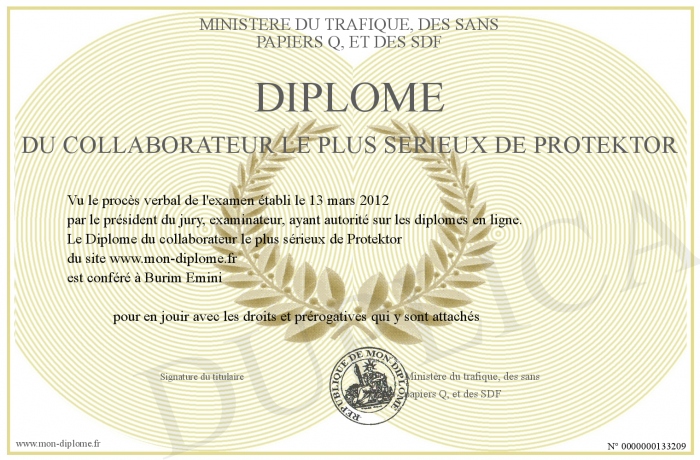 Envoyez par email votre Diplôme du collaborateur le plus sérieux de Protektor personalisé