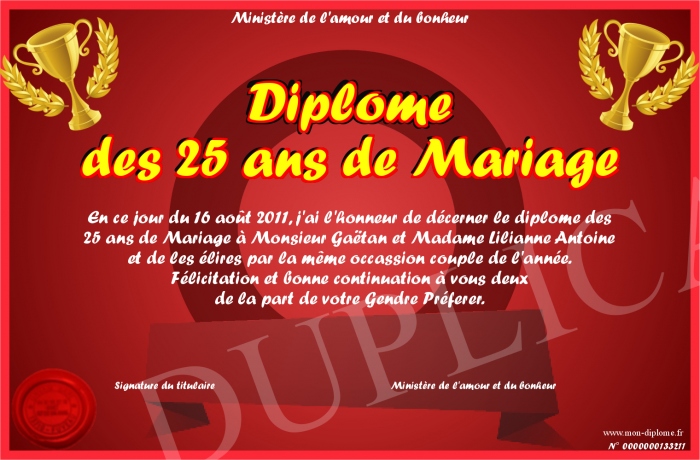 Envoyez par email votre Diplôme des 25 ans de Mariage personalisé