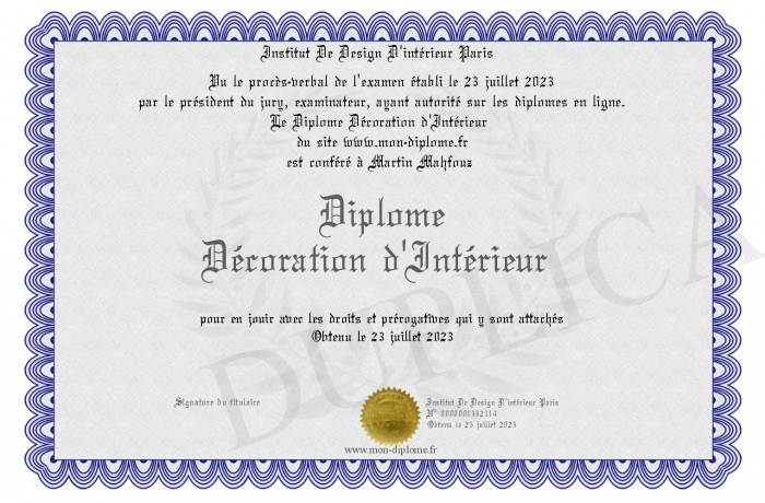 Envoyez par email votre Diplôme Décoration d'Intérieur personalisé