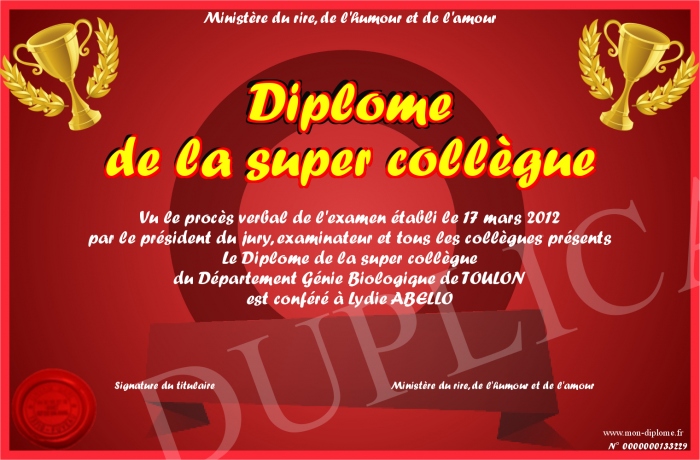 Envoyez par email votre Diplôme de la super collègue personalisé