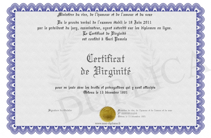 Envoyez par email votre Certificat de Virginité personalisé