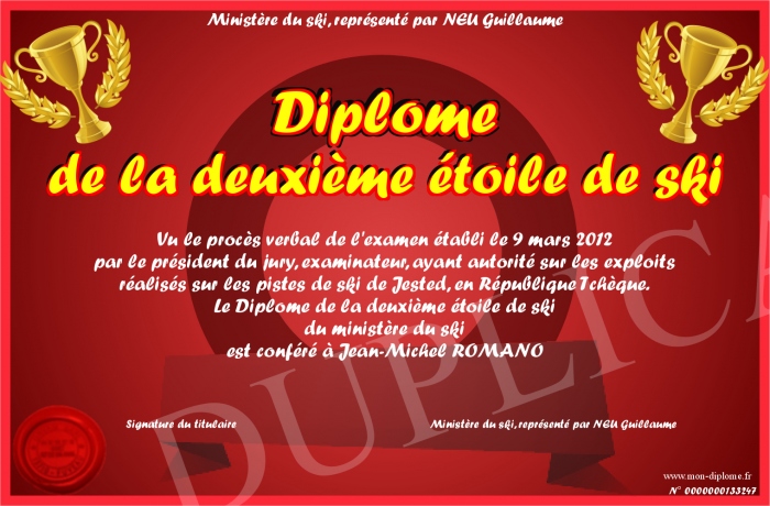 Envoyez par email votre Diplome de la deuxième étoile de ski personalisé