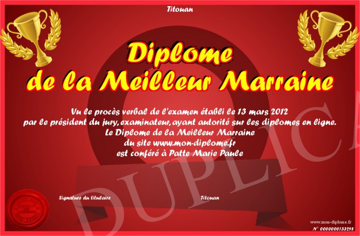 Envoyez par email votre Diplôme de la Meilleur Marraine personalisé