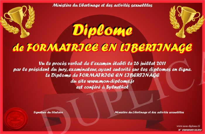 Envoyez par email votre Diplôme de FORMATRICE EN LIBERTINAGE personalisé