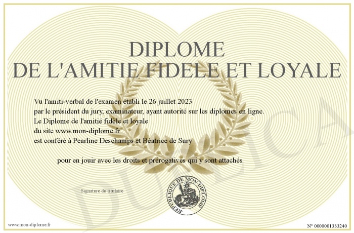 Envoyez par email votre Diplôme de l'amitié fidèle et loyale personalisé