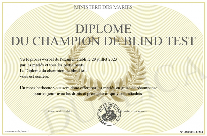 Envoyez par email votre Diplôme du champion de blind test personalisé