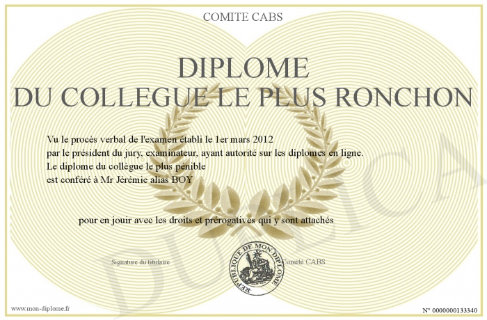 Envoyez par email votre Diplôme du collègue le plus ronchon personalisé