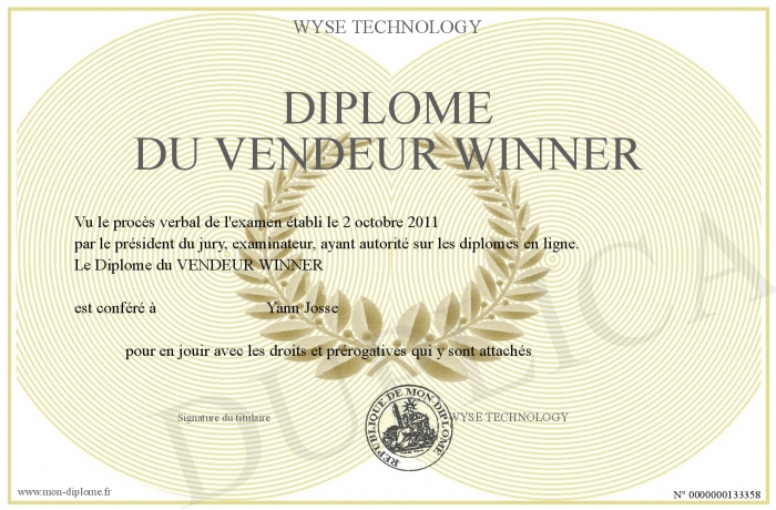 Envoyez par email votre Diplôme du VENDEUR WINNER personalisé