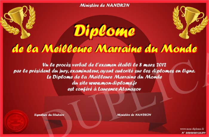 Envoyez par email votre Diplôme de la Meilleure Marraine du Monde personalisé