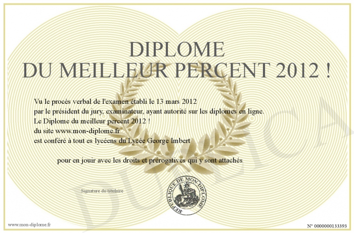 Envoyez par email votre Diplôme du meilleur percent 2012 ! personalisé