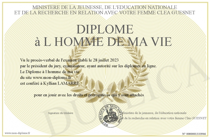 Envoyez par email votre Diplôme à l homme de ma vie personalisé
