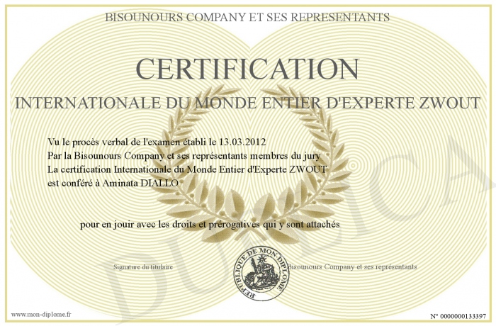 Envoyez par email votre certification Internationale du Monde Entier d'Experte ZWOUT personalisé