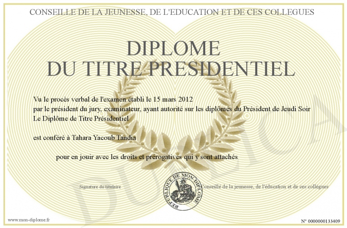 Envoyez par email votre Diplôme du Titre Présidentiel personalisé
