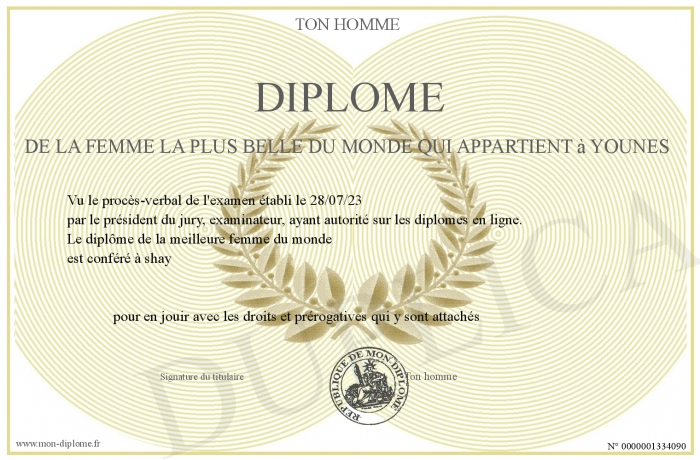 Envoyez par email votre Diplôme de la femme la plus belle du monde qui appartient à Younes personalisé