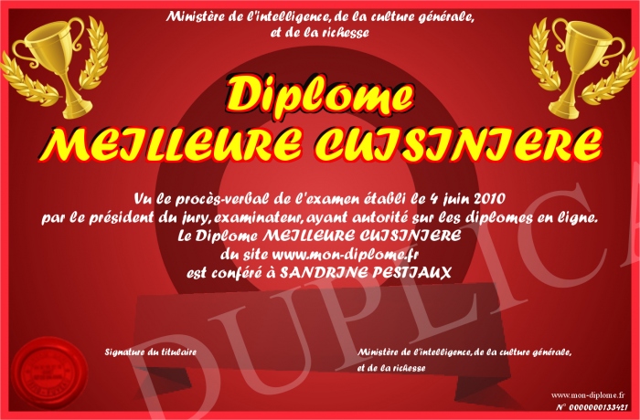 Envoyez par email votre Diplôme MEILLEURE CUISINIERE personalisé