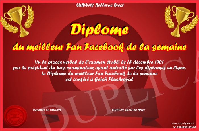 Envoyez par email votre Diplôme du meilleur Fan Facebook de la semaine personalisé