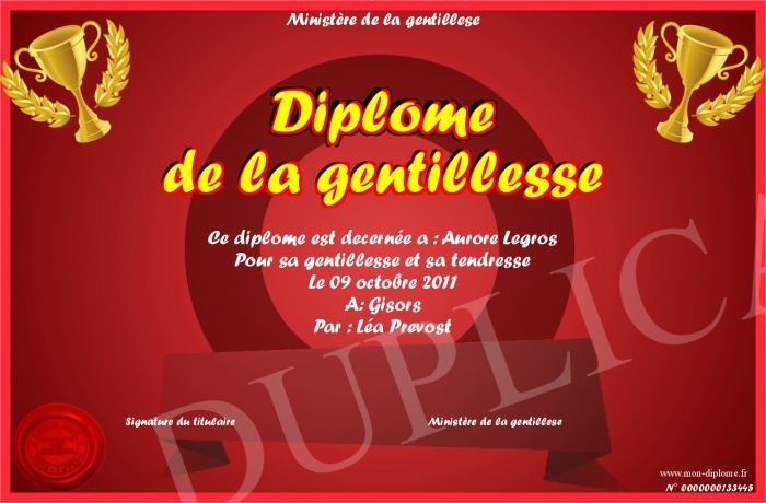Envoyez par email votre Diplôme de la gentillesse personalisé