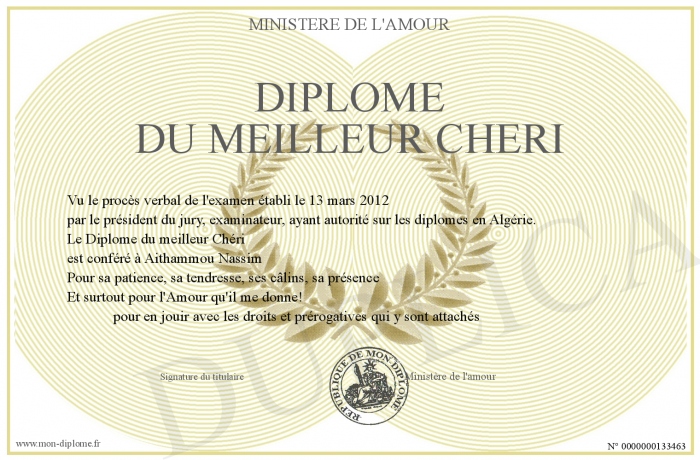 Envoyez par email votre Diplome du meilleur Chéri personalisé