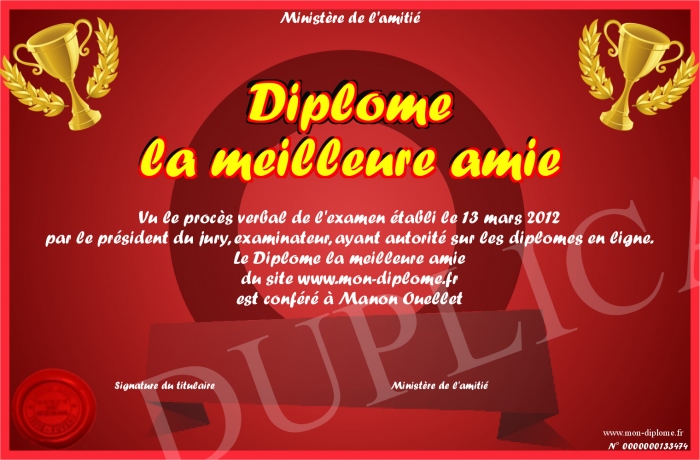 Envoyez par email votre Diplôme la meilleure amie personalisé