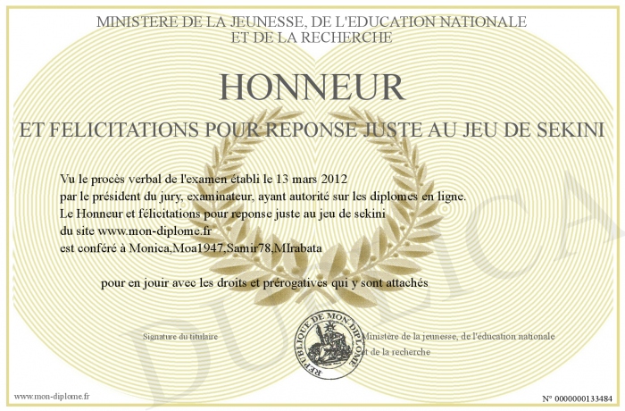 Envoyez par email votre Honneur et félicitations pour reponse juste au jeu de sekini personalisé
