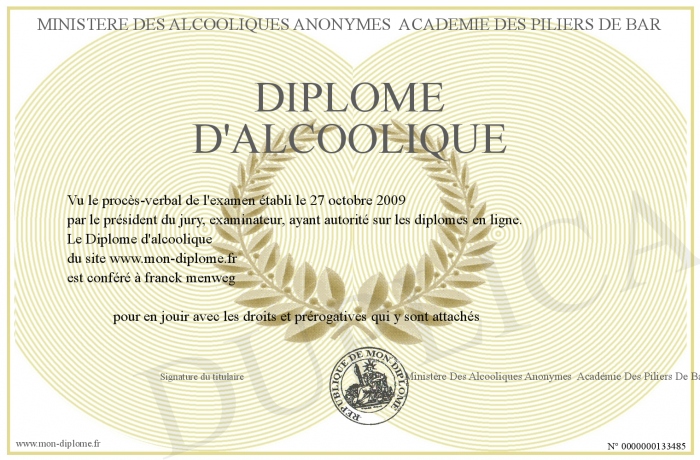 Envoyez par email votre Diplôme d'alcoolique personalisé