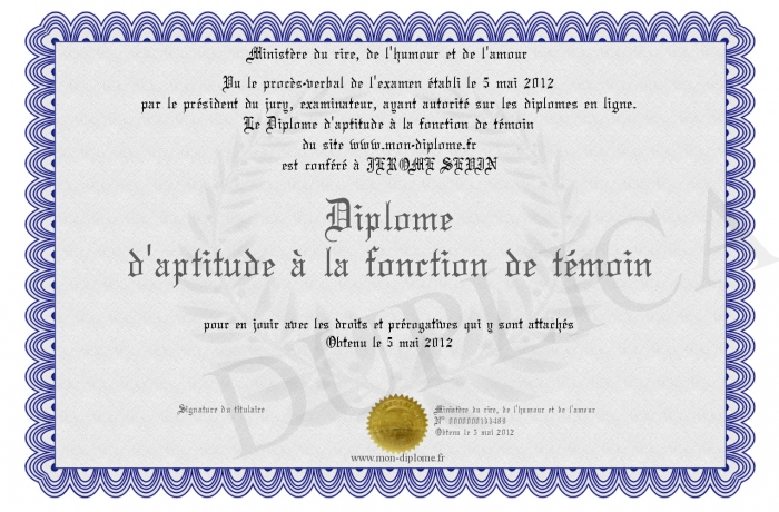 Envoyez par email votre Diplome d'aptitude à la fonction de témoin personalisé
