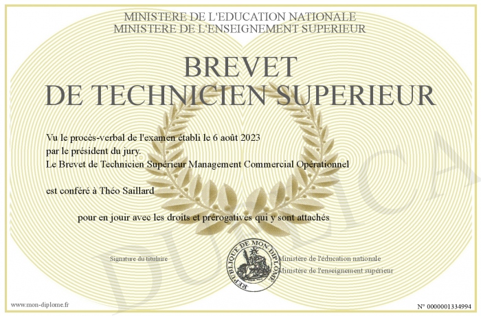 Envoyez par email votre Brevet de Technicien Supérieur personalisé