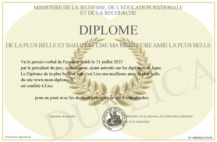 Envoyez par email votre Diplôme de la plus belle et bah c'est Lise ma meilleure amie la plus belle personalisé