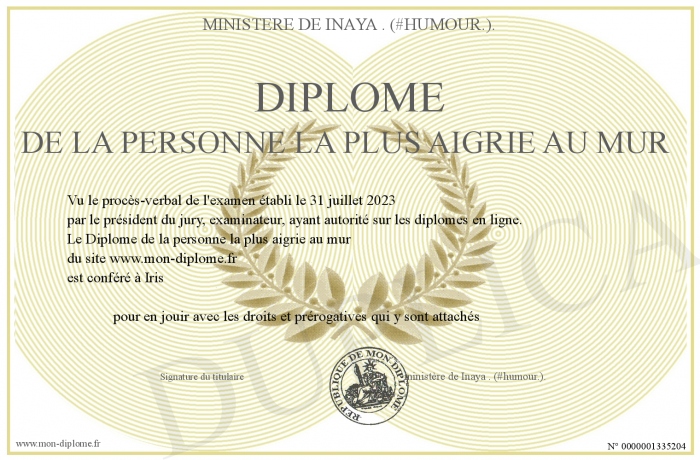 Envoyez par email votre Diplôme de la personne la plus aigrie au mur personalisé