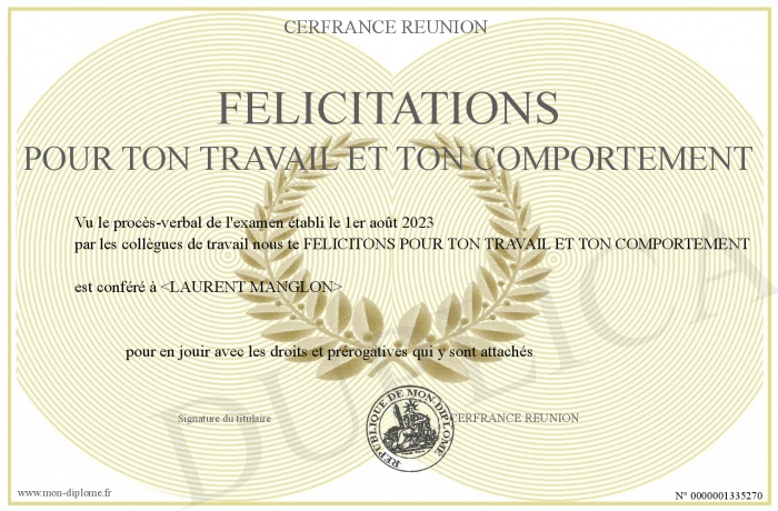 Envoyez par email votre FELICITATIONS POUR TON TRAVAIL ET TON COMPORTEMENT personalisé