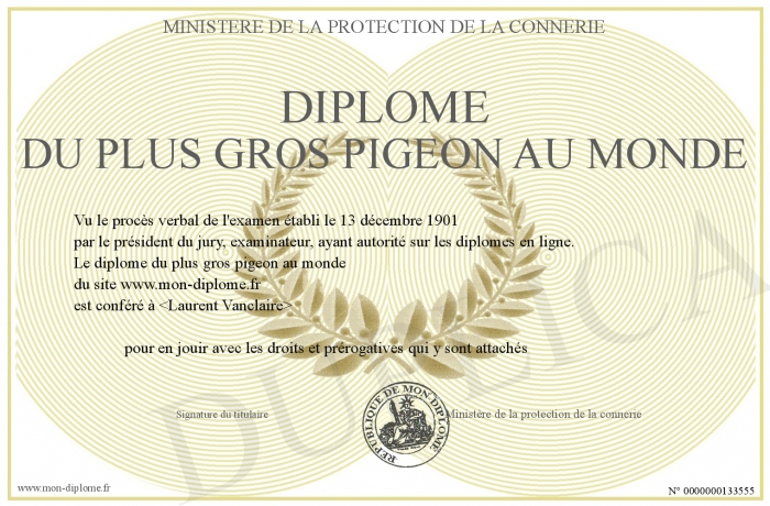 Envoyez par email votre diplome du plus gros pigeon au monde personalisé